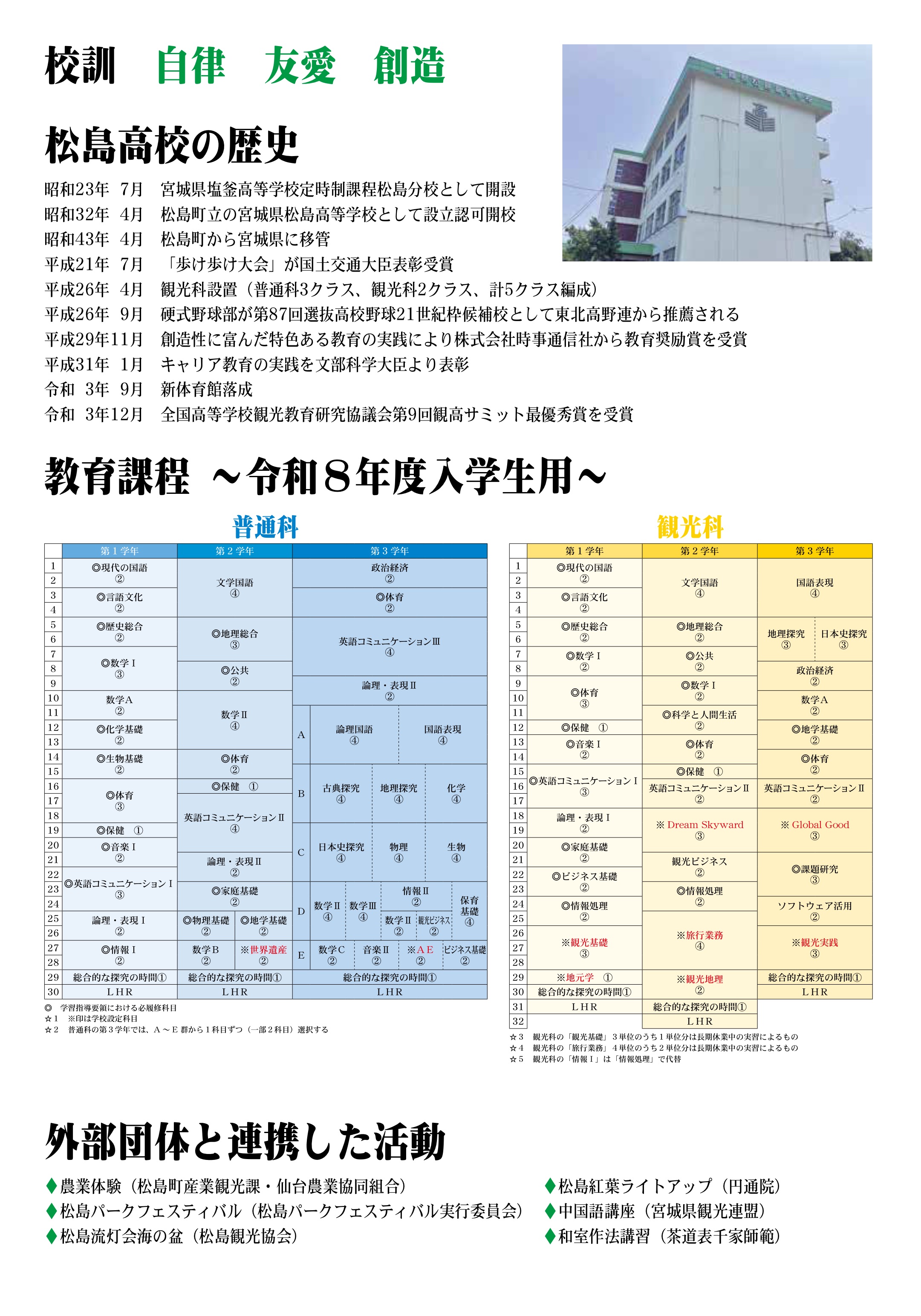 宮城県松島高等学校〒981-0215宮城県宮城郡松島町高城字迎山三5TEL : 022-354-3307FAX : 022-354-5847